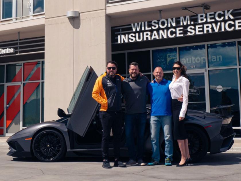 Three men and one woman are standing in front of a high-end grey sports car with suicide doors open. They have their arms around one another and are smiling at the camera. The photo is taken outside on a sunny day with offices behind them.